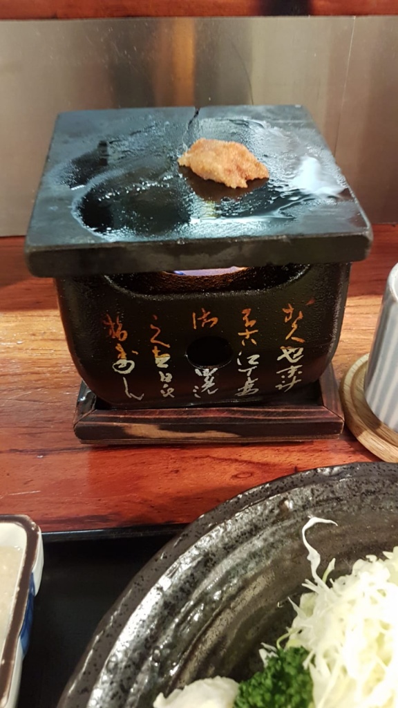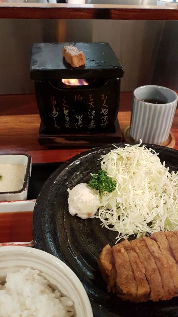 Le midi je voulais manger un yakiniku (barbecue japonais) mais il n’y avait pas de resto de yakiniku dans les parages. Nous avons donc opté pour une variante, du gyukatsu. Du bœuf pané. Mais ce n’est pas seulement du bœuf pané. Il faut le faire un peu plus cuire sur une petite plaque chauffante devant nous. Une sorte de variante au barbecue.