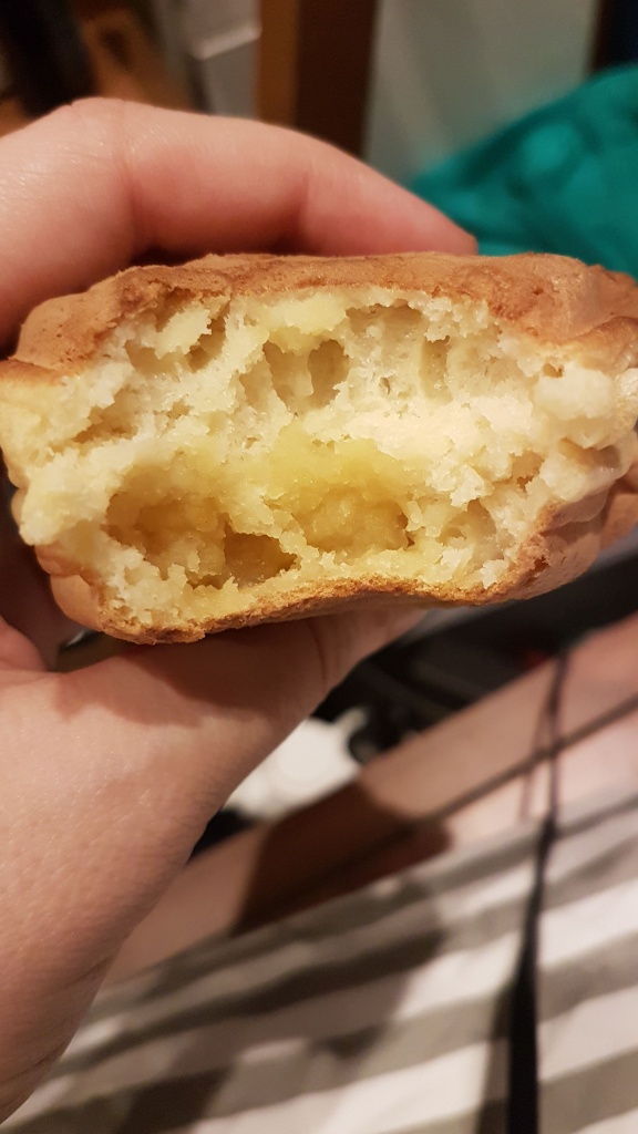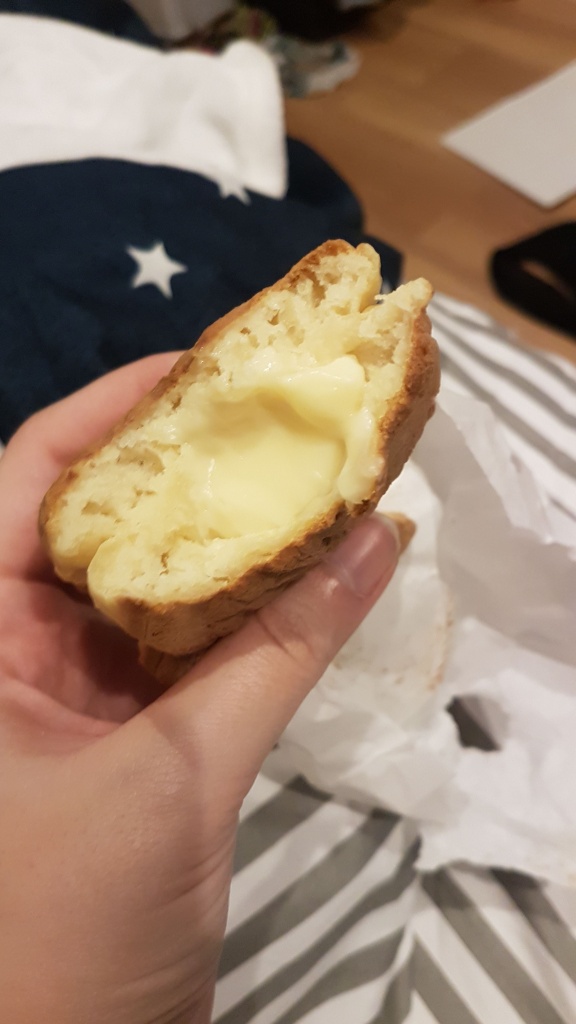La plupart du temps, il est fourré avec de la pâte d’anko, une pâte de haricots rouges sucrés. D’autres garnitures possibles incluent la crème pâtissière, la crème au chocolat et la crème au fromage. Mais chaque vendeur est libre d’innover. Par exemple celui dans lequel je vais, propose du fourrage goût yuzu (un agrume japonais).